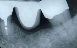 この症例は、歯周病により多くの骨量が吸収されているため抜歯しました。また、抜歯した両隣の歯の根のまわりも歯周病により骨量が少なく、そのため歯に中度の動きが認められました。もし、ブリッジ治療を適用した場合は、ブリッジ全体が徐々に動きが増すようになり、予後は大変不安となるでしょう。また、インプラントを埋めるための骨量の不足が考えられます。さらに多くの歯が動いているような場合は、インプラントだけ動きがないので天然の歯との不調和が生じ、噛む機能に障害が起こることになるでしょう。